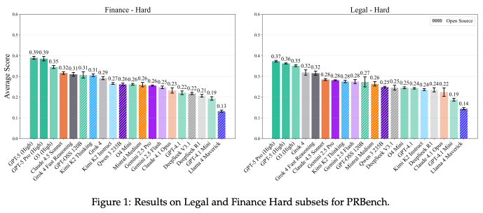 在代表最具挑战性案例的「困难子集」 (Hard subset)上 ,表现最好的模型(GPT-5 Pro/GPT-5)在金融和法律上的得分也仅为0.39和0.37。